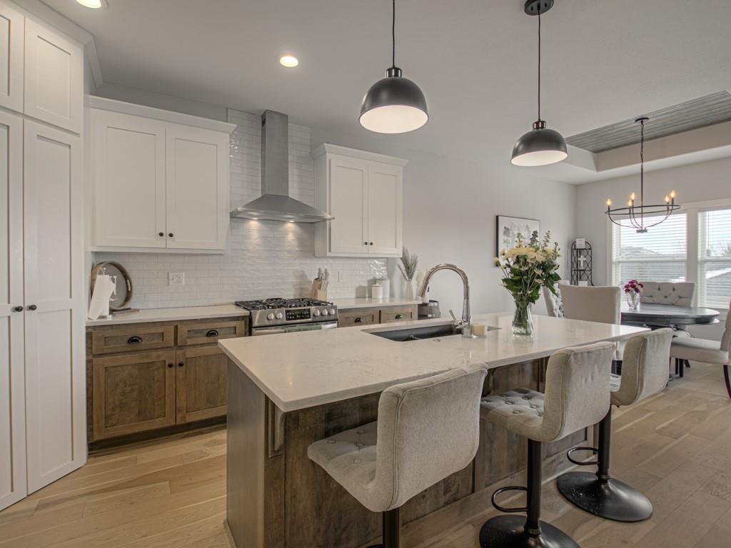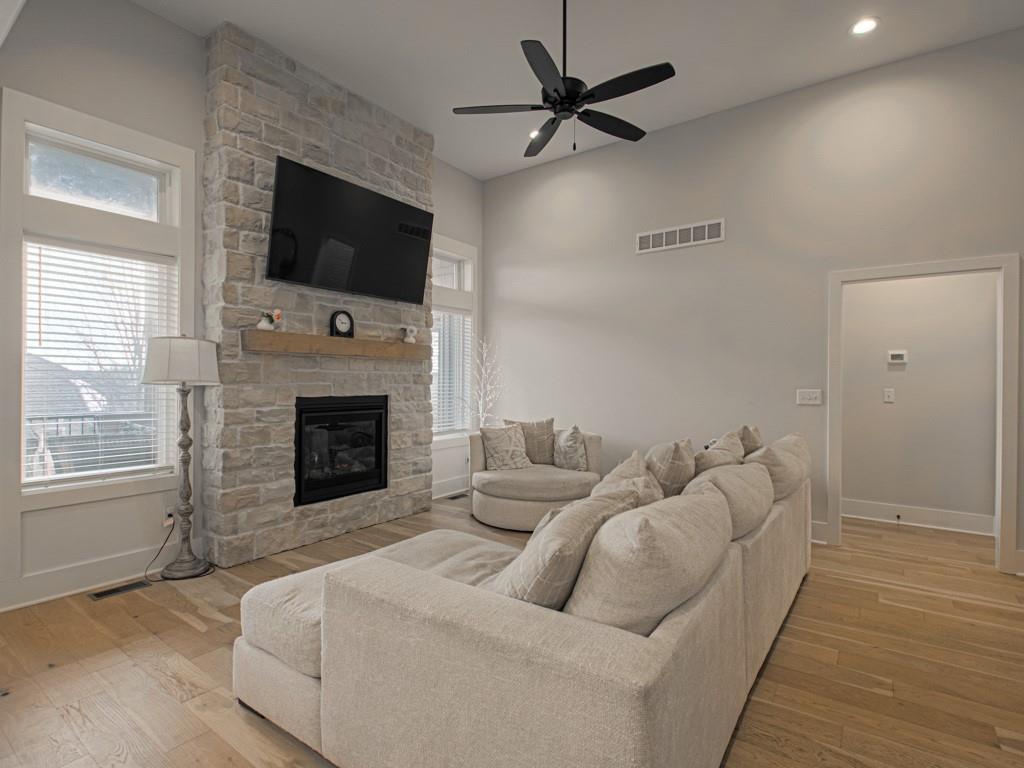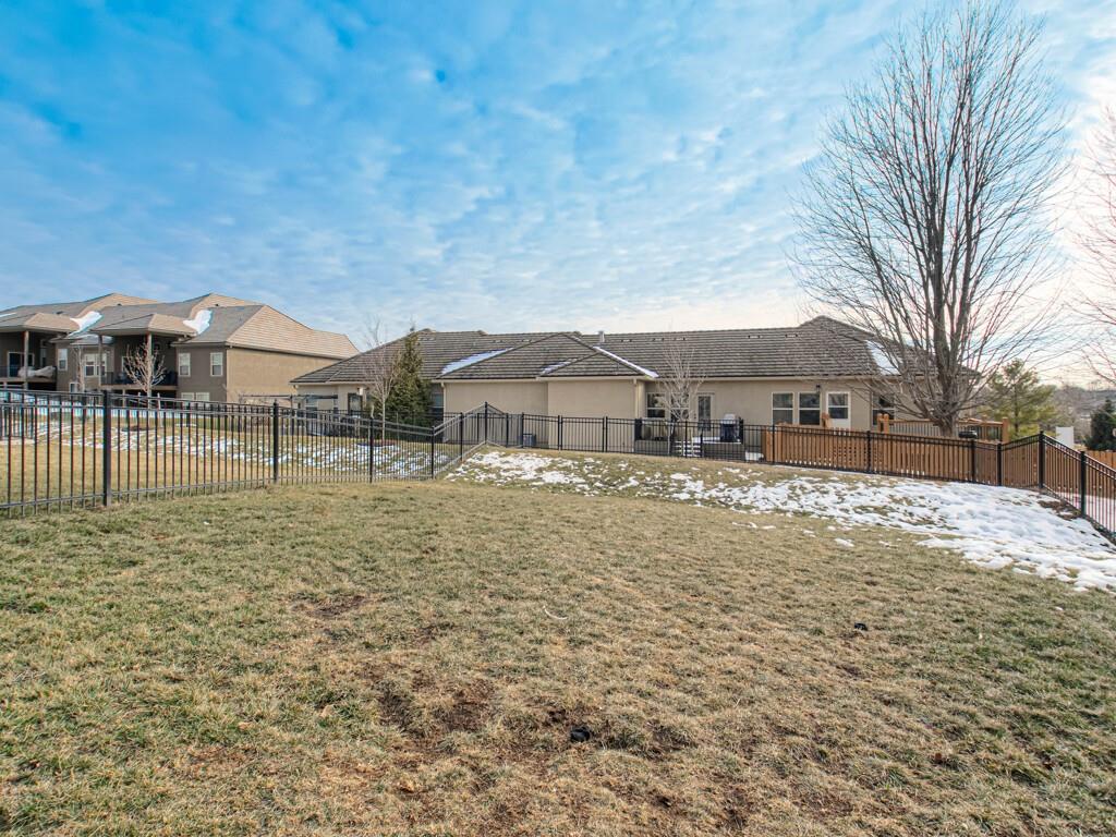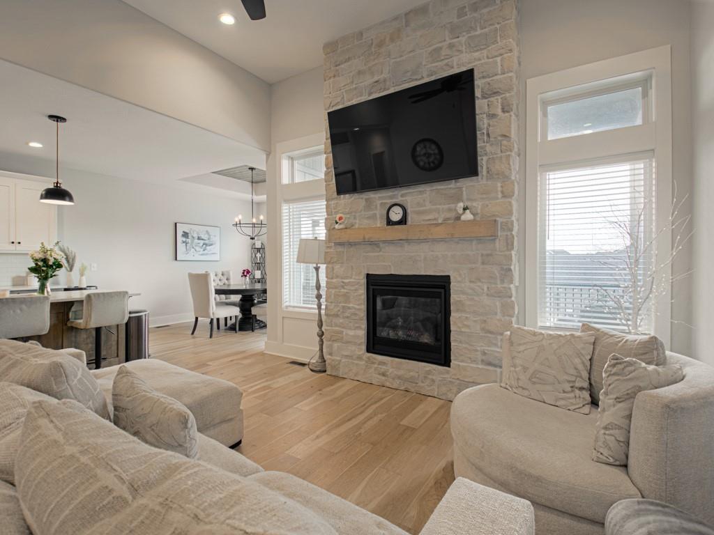 Enjoy easy, maintenance-free living in this custom-built townhouse located in Lakewood’s Chapel Ridge subdivision. Built just three years ago, this one-and-a-half story ranch-style plan offers true main-level living with thoughtful design throughout. The great room features high ceilings, wood floors, and a stone fireplace, opening to a well-appointed kitchen with granite countertops, stainless steel appliances, five-burner gas stove, tiled backsplash, walk-in pantry, and convenient eat-at bar. The main-level dining area walks out to a covered deck with low-maintenance decking, also accessible from the primary suite—perfect for relaxing with minimal upkeep. Main-level laundry adds to the convenience. The main-level primary suite offers a raised ceiling with wood inlay, walk-in closet, and a luxury bath featuring double vanities, added cabinetry for extra storage, and an oversized tiled shower. A finished walkout lower level provides a spacious family room, third bedroom, third full bath, and generous storage, with access to a patio and fenced backyard—ideal for guests or hobbies without daily stairs. Attached two-car garage on the main level. Exterior maintenance, lawn care, and snow removal are included, allowing more time to enjoy Lakewood’s amenities, including two lakes, marinas, swimming pools, tennis courts, and a golf course.