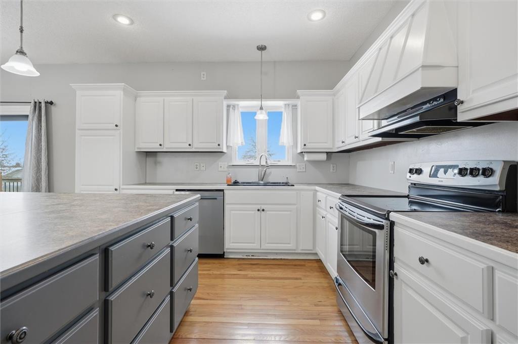 Spacious 4 bed, 2.5 bath, 3,400 sq ft 1.5-story home in the desirable Oaks of Edgewood. Hardwood floors welcome you into an oversized carpeted living/family area with a large window for natural light. The main-level kitchen features a large island, stainless steel appliances, pantry, kitchen/dining combo, and deck access. Half bath conveniently located on the main level. The primary suite, also located on the main level, is a true retreat with a fireplace, private deck, walk-in closet, attached laundry, and a double-door entry to the bathroom with double sinks, soaking tub, and tiled walk-in shower. Lower-level living quarters include three bedrooms, a kitchen, full bath, additional laundry, and abundant storage. Patio and fenced backyard complete the space. Additional highlights: solid-wood doors throughout, a 3-car garage, and ample basement storage. Grain Valley School District. Ready for its new owners!